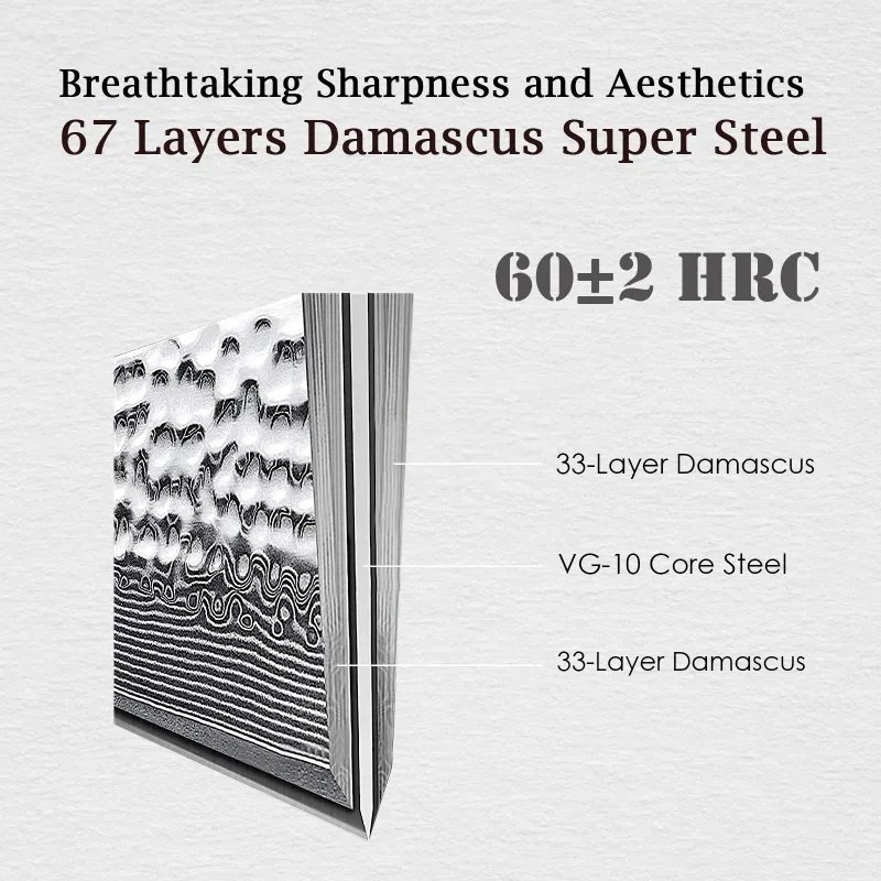 • SHARP SANTOKU KNIFE - Japanese santoku knife is made with Japanese VG-10 steel core, 67 layers real damascus steel for excellent edge retention. HRC 60±2, excellent rust resistance and wear resistance. The Santoku knife, also known as the Japanese chef's knife, has superior performance and is characterized by slicing, dicing, and chopping.