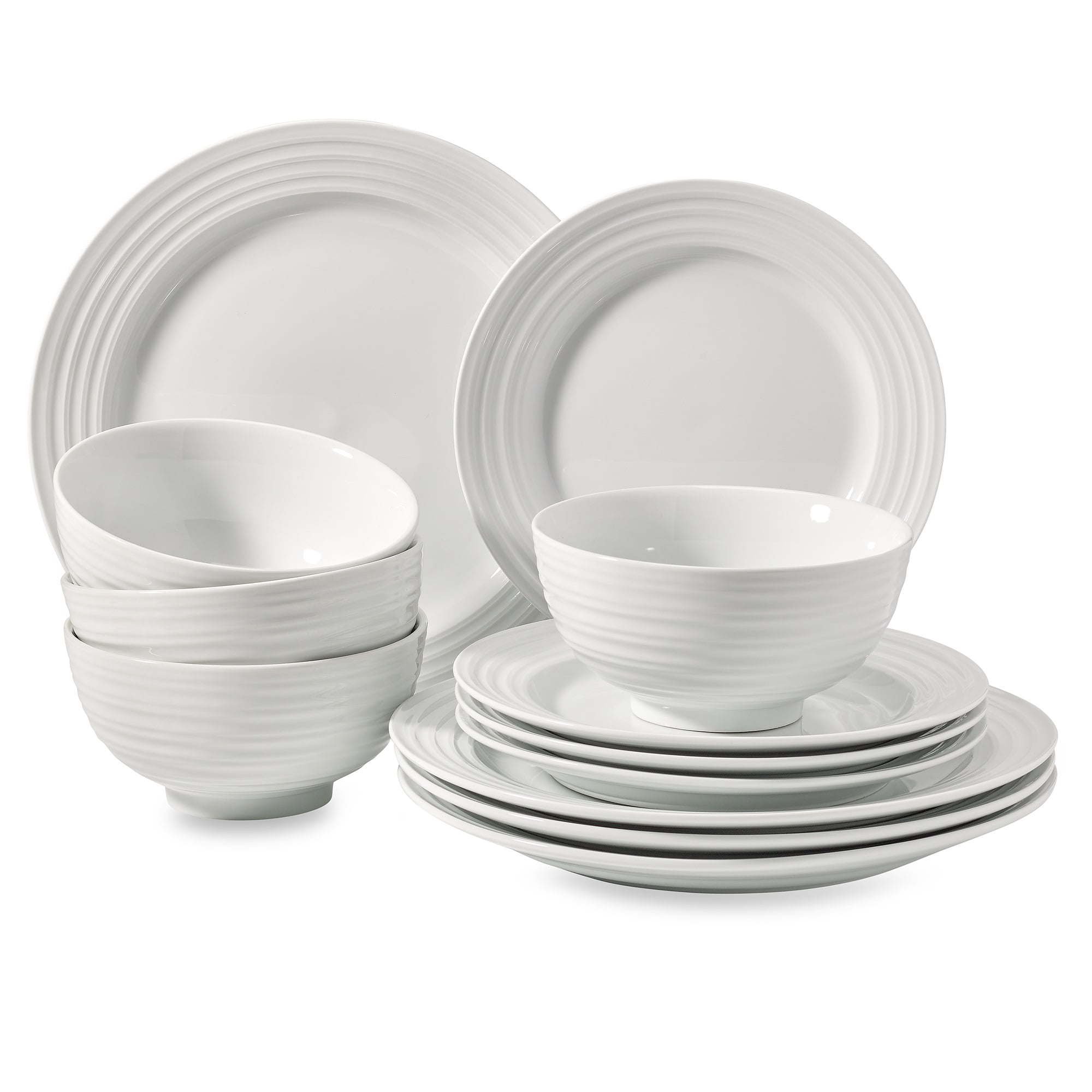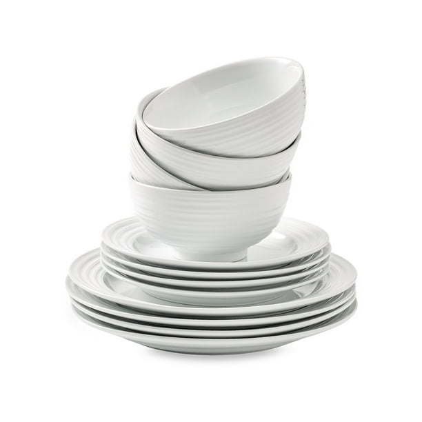 Upgrade your dining collection with the Better Homes & Gardens Porcelain 12-Piece Anniston Dinnerware Set. The set includes four dinner plates, four salad plates, and four bowls. This durable porcelain dinnerware set is conveniently dishwasher and microwave safe. This elegant Better Homes and Gardens Anniston set would pair great in any dining room with it's classic design and shape. Easy to dress up for a dinner party with friends or enjoy as a casual meal.