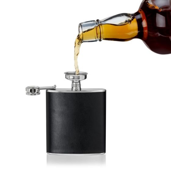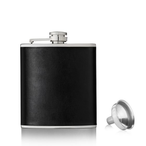 Svelte black faux leather collides with the lustre of stainless steel to make this pocketable six-ounce flask. With a tight-fitting screw top and clever stainless flask funnel, all you need is liquor.