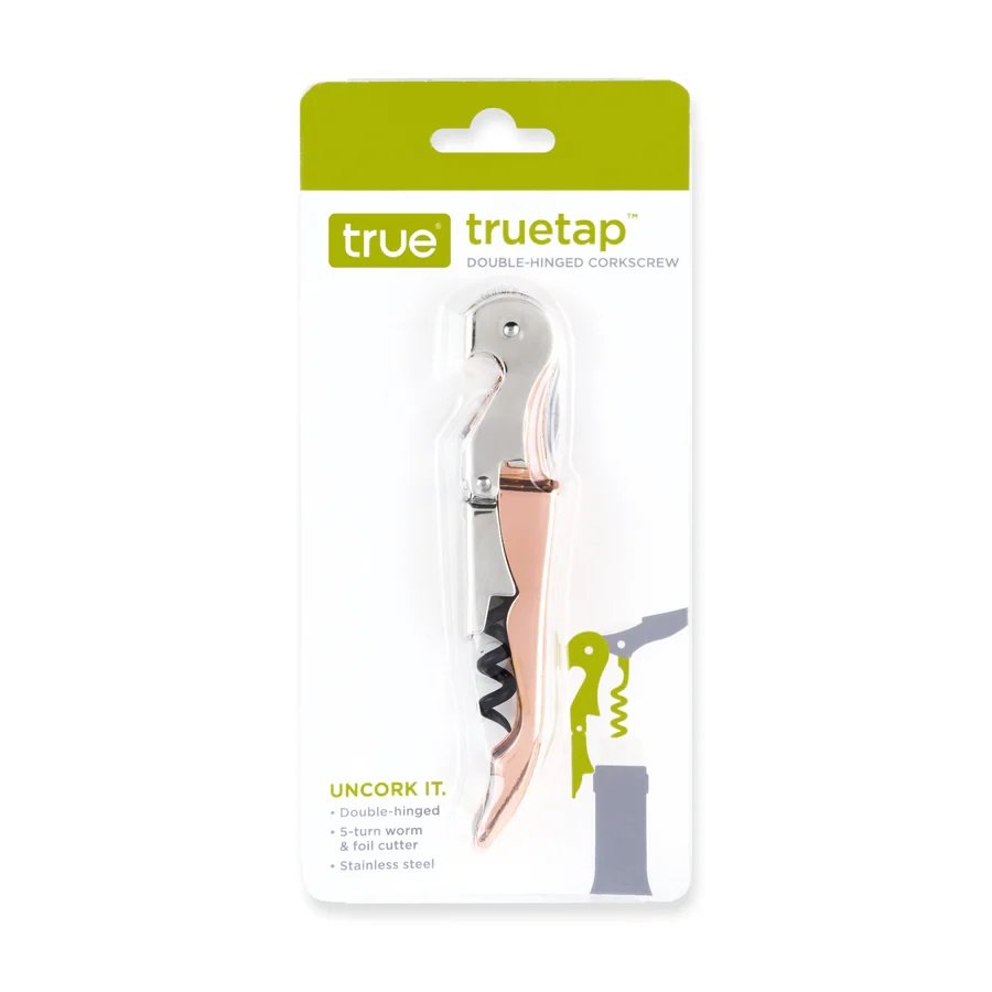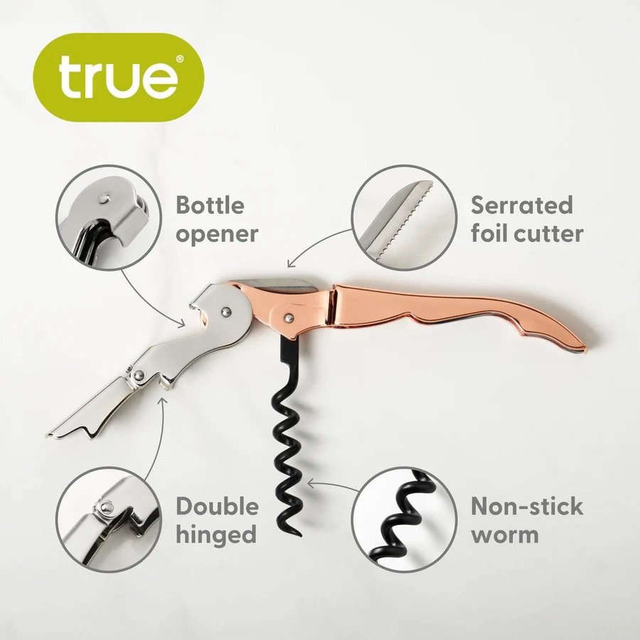 In a beautiful Copper finish, our most iconic wine opener received an on-trend update. Uncorking is effortless thanks to the superior double-hinged design and non-stick worm of the Truetapâ„¢ Double-Hinged Corkscrew. Complete with an integrated bottle opener and serrated foil cutter.
